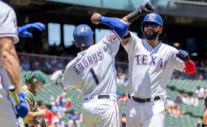 Texas Rangers' Nomar Mazara, right, is congratulated by Elvis Andrus (1) after hitting a two-run home run that scored Andrus off of Oakland Athletics starting pitcher Paul Blackburn during the third inning of the first baseball game of a doubleheader Saturday, June 8, 2019, in Arlington, Texas. (AP PhotoJeffrey McWhorter)