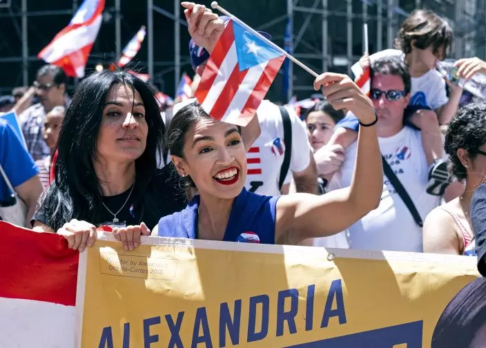 Rep. Alexandria Ocasio-Cortez, D-N.Y., center, takes part in the National Puerto Rican Day Parade Sunday, June 9, 2019, in New York. (AP PhotoCraig Ruttle)