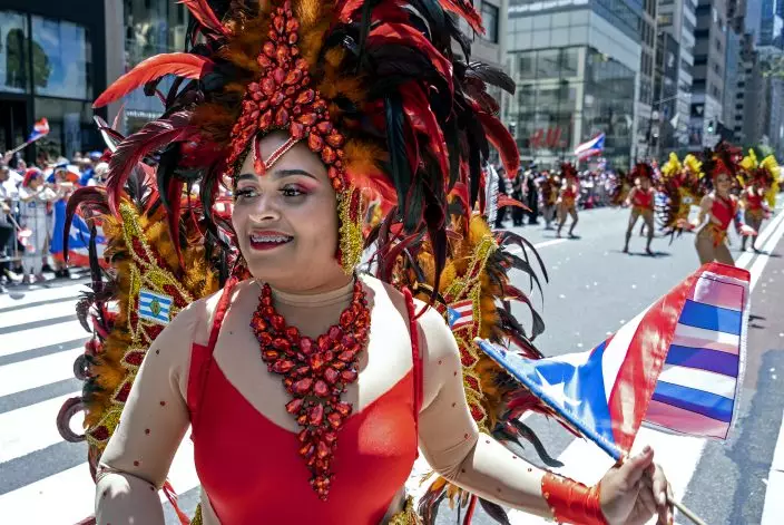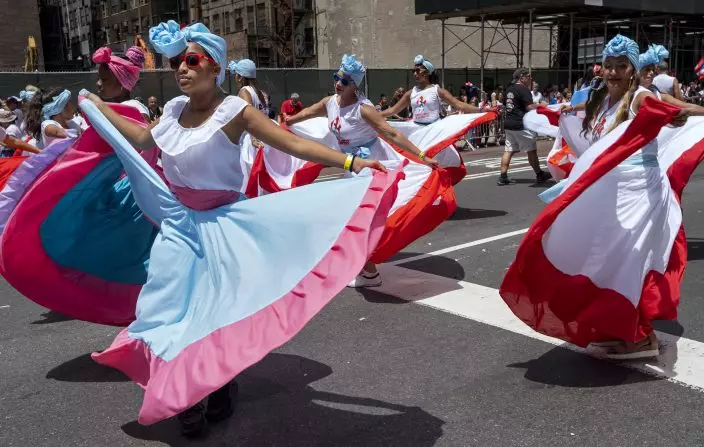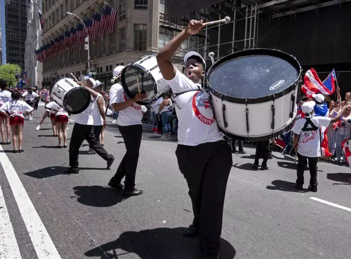 A parade unit entertains spectators during the National Puerto Rican Day Parade Sunday, June 9, 2019, in New York. (AP PhotoCraig Ruttle)