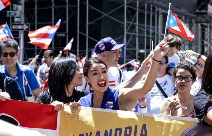 Rep. Alexandria Ocasio-Cortez, D-N.Y., center, takes part in the National Puerto Rican Day Parade Sunday, June 9, 2019, in New York. (AP PhotoCraig Ruttle))