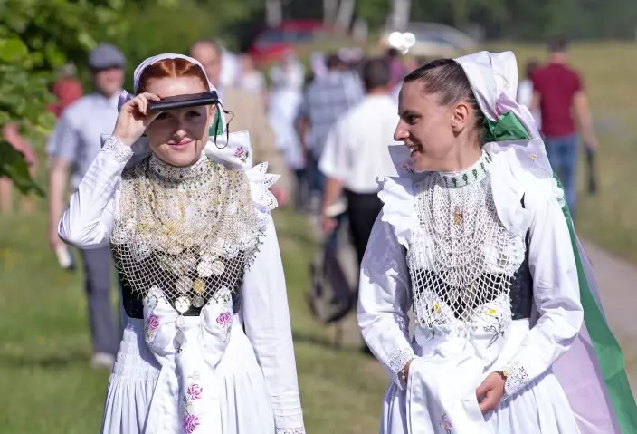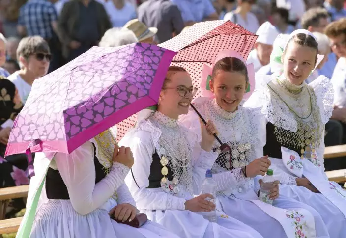 Women dressed in the traditional clothes of the Sorbs arrives for the service during a procession in Rosenthal, eastern Germany, Monday, June 10, 2019. Traditionally on White Monday catholic faithful Sorbs, a Slavic minority near the German-Polish border, celebrate an open air mass in the small village east of Dresden. (AP PhotoJens Meyer)