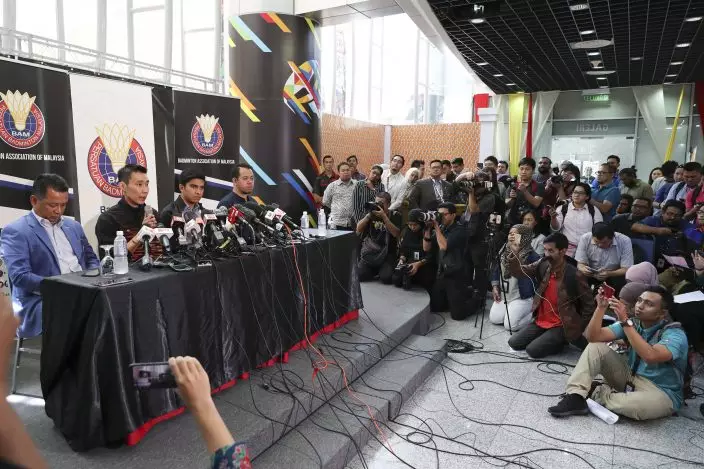 Malaysian badminton player Lee Chong Wei, second from left, speaks during a press conference in Putrajaya, Malaysia, Thursday, June 13, 2019. Former World No. 1-ranked Lee has announced his retirement from badminton after 19 years following his battle with cancer. (AP PhotoVincent Thian)