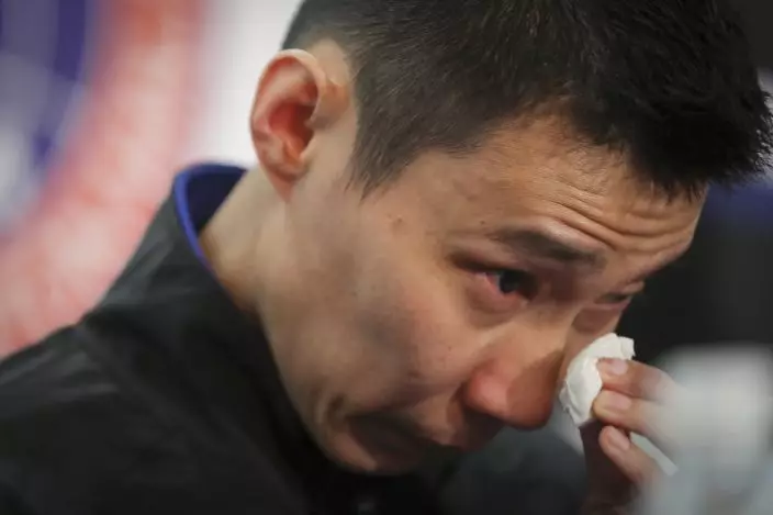 Malaysian badminton player Lee Chong Wei wipes his tears during a press conference in Putrajaya, Malaysia, Thursday, June 13, 2019. Former World No. 1-ranked Lee has announced his retirement from badminton after 19 years following his battle with cancer. (AP PhotoVincent Thian)