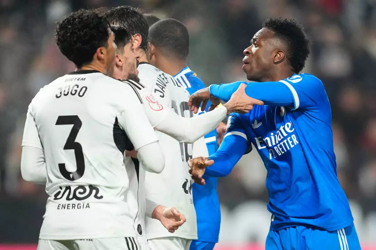 Real Madrid's Vinicius Junior argues with Albacete's players during the Copa del Rey round of 16 soccer match between Albacete and Real Madrid, in Albacete, Spain, Wednesday, Jan. 14, 2026. (AP Photo/Jose Breton)