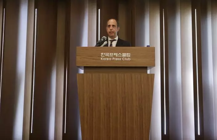 Tomas Ojea Quintana, the United Nations special rapporteur on the situation of human rights in North Korea, speaks during a press conference in Seoul, South Korea, Friday, June 21, 2019. Quintana said there are signs the country and China are strengthening their efforts to track down people who have escaped from the North. (AP PhotoAhn Young-joon)