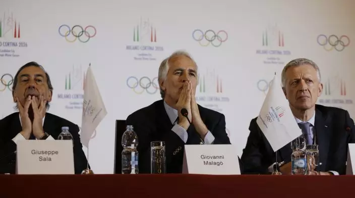 FILE - In this Saturday, April 6, 2019 file photo, from left, Milan mayor Giuseppe Sala is flanked by President of the Italian National Olympic Committee, CONI, Giovanni Malago' and Winter Olympics Milano Cortina bid IOC Evaluation Commission manager Octavian Morariu, during a winter Olympics Milan Cortina bid IOC Evaluation Commission final news conference, in Milan, Italy.  Two candidates have stayed on the ballot to be held on Monday, June 24, 2019 to pick the 2026 Winter Olympics host. The IOC worked hard to help keep the Italian and Swedish candidates in the contest, giving both extra time to get their government’s backing amid taxpayer concerns that Olympic hosting is an expensive luxury. Olympic officials hope the 2026 contest can shape a more efficient type of bidding and hosting. (AP PhotoLuca Bruno, File)
