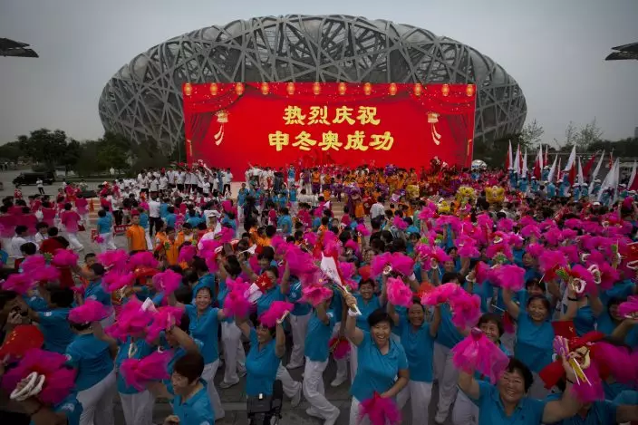 FILE - In this Friday, July 31, 2015 file photo, participants celebrate following the announcement that Beijing will host the 2022 Winter Olympics at a gathering outside of the Beijing Olympic Stadium, also known as the Birds Nest, in Beijing. The sign reads "Warm celebration of the successful Winter Olympics bid". Two candidates have stayed on the ballot to be held on Monday, June 24, 2019 to pick the 2026 Winter Olympics host. The IOC worked hard to help keep the Italian and Swedish candidates in the contest, giving both extra time to get their government’s backing amid taxpayer concerns that Olympic hosting is an expensive luxury. Olympic officials hope the 2026 contest can shape a more efficient type of bidding and hosting. (AP PhotoMark Schiefelbein, File)