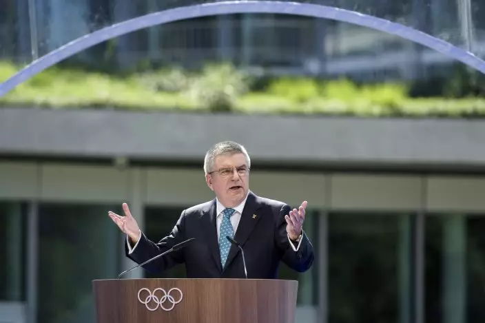 International Olympic Committee (IOC) president Thomas Bach delivers a speech during the inauguration of the new IOC headquarter on Sunday,  June 23, 2019 in Lausanne ahead of the decision on 2026 Winter Games host. (Fabrice CoffriniPoolKeystone via AP)