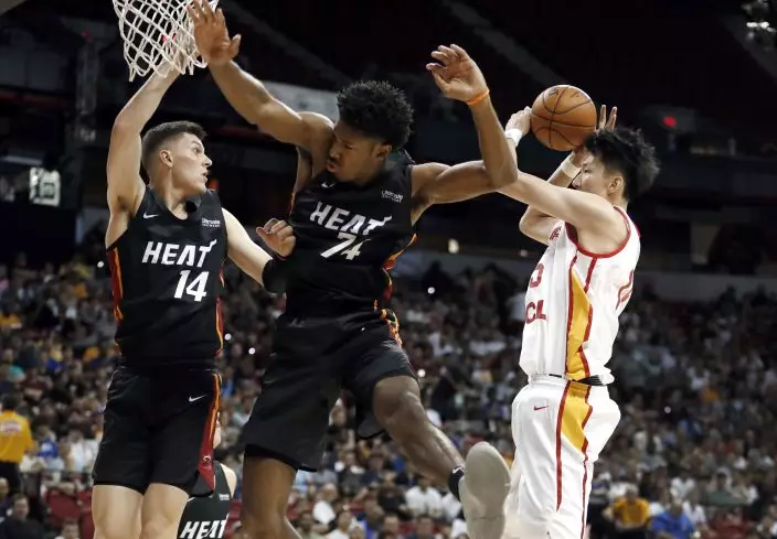 China's Zhou Qi, right, tries to shoot as Miami Heat's Tyler Herro (14) and Kyle Alexander (74) defend during an NBA summer league basketball game Friday, July 5, 2019, in Las Vegas. (AP PhotoSteve Marcus)