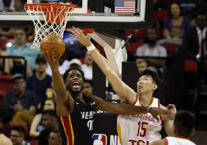 Miami Heat's Yante Maten (0) lays up the ball against China's Zhou Qi (15) during an NBA summer league basketball game Friday, July 5, 2019, in Las Vegas. (AP PhotoSteve Marcus)