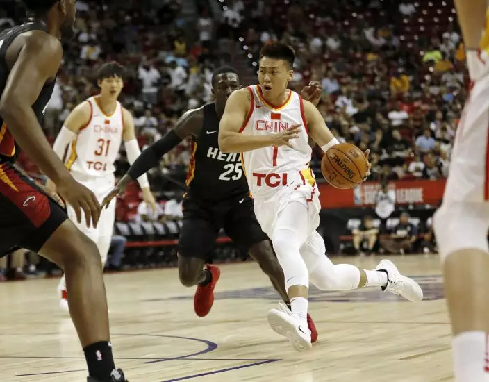 China's Zhao Rui (1) drives toward the basket past Miami Heat's Kendrick Nunn (25) during an NBA summer league basketball game Friday, July 5, 2019, in Las Vegas. (AP PhotoSteve Marcus)