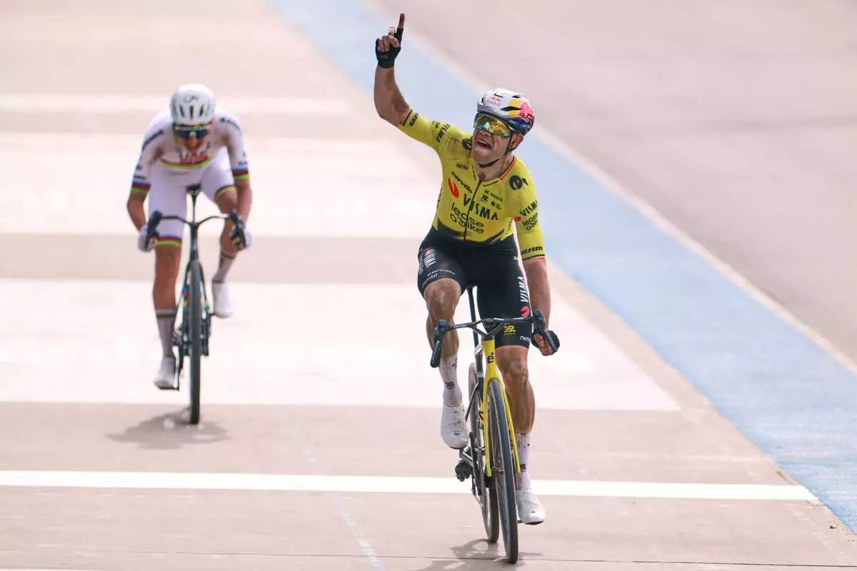 Belgium's Wout van Aert crosses the finish line ahead of Tadej Pogacar of Slovenia, left, to win the Paris-Roubaix cycling race in Roubaix, France, Sunday, April 12, 2026. Van Aert pointed his finger skywards to commemorate Belgian cyclist Michael Goolaerts who died after crashing in the race in 2018. (AP Photo/Jean-Francois Badias)