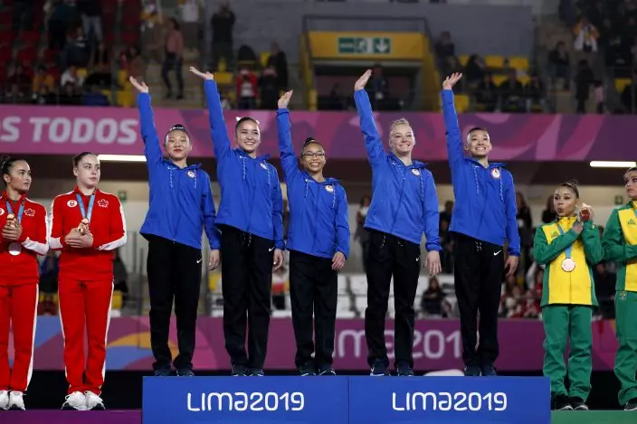 The U.S. women's gymnastics team waves as they take the medals podium to receive gold in the women's gymnastics team final at the Pan American Games in Lima, Peru, Saturday, July 27, 2019. From left, are Kara Eaker, Aleah Finnegan, Morgan Hurd, Riley McCusker, and Leanne Wong. (AP PhotoRebecca Blackwell)