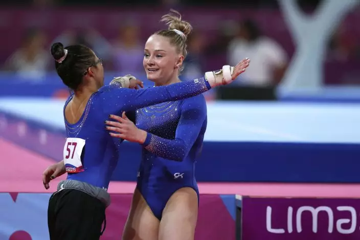 Riley McCusker of the U.S., right, is embraced by teammate Morgan Hurd, after competing on floor in the women's gymnastics qualification and team final at the Pan American Games in Lima, Peru, Saturday, July 27, 2019. (AP PhotoRebecca Blackwell)