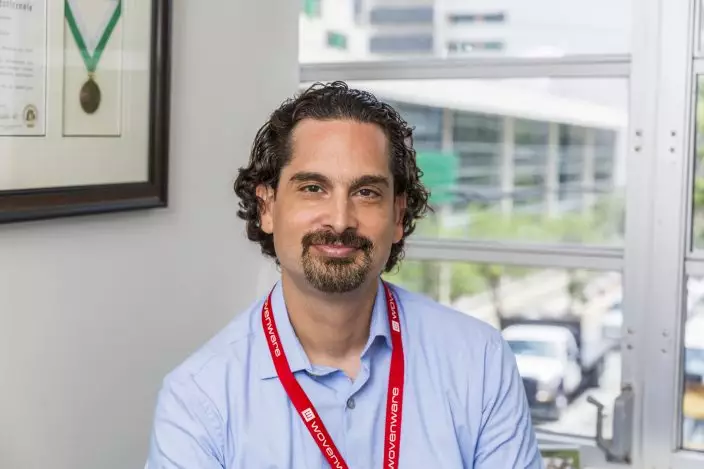 In this undated photo provided by Wovenware, Inc., Carlos Melendez, Wovenware Co-Founder and COO, poses for a photo at the Wovenware office in Santurce, San Juan, Puerto Rico. When Hurricane Irma hit Puerto Rico in September 2017, Melendez learned lessons that would help his business during the next storm. He got to use them two weeks later, when Hurricane Maria decimated the island, giving Melendez further instruction about the need to be prepared. (Jerry MonkmanWovenware, Inc. via AP)