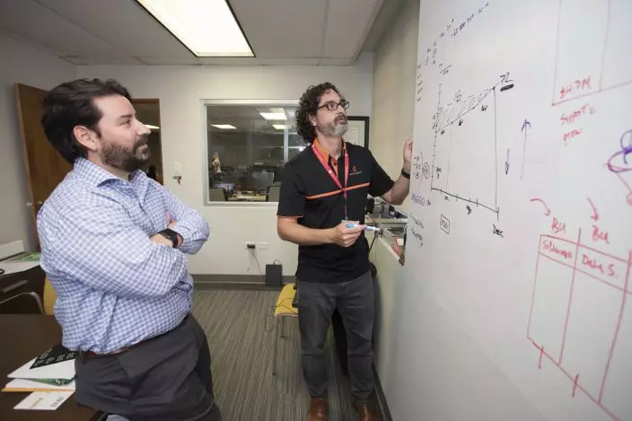 In this undated photo provided by Wovenware, Inc., Carlos Melendez, Wovenware Co-Founder and COO, right, talks with Christian Gonzalez, Wovenware Co-Founder and CEO, as they discuss the performance of a deep learning algorithm at the Wovenware office in Santurce, San Juan, Puerto Rico. When Hurricane Irma hit Puerto Rico in September 2017, Melendez learned lessons that would help his business during the next storm. He got to use them two weeks later, when Hurricane Maria decimated the island, giving Melendez further instruction about the need to be prepared. (Javier Vazquez RosadoWovenware, Inc. via AP)