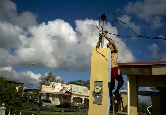 FILE - In this Oct. 13, 2017, file photo, a resident tries to connect electrical lines downed by Hurricane Maria in preparation for when electricity is restored in Toa Baja, Puerto Rico. Despite the potential for hurricanes and other natural disasters, many small business owners don’t prepare for the worst, leaving them to learn during a crisis what they should have done differently. (AP PhotoRamon Espinosa, File)