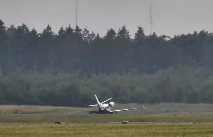 A private aircraft lays off the runway after it caught fire on landing at Aarhus Airport in Tirstrup, Denmark, Tuesday, Aug. 6, 2019.  Flying from Oslo in Norway, the plane was believed to be carrying the manager and crew of pop singer Pink, who had given a concert in Oslo.  None of the passengers are thought to have been injured in the incident. (Photo: Bo Amstrup  Ritzau Scanpix via AP)