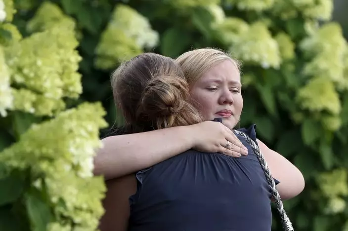 Mourners embrace after a mass in the chapel on the campus of Saint Francis University to celebrate the life of Nicholas Cumer on Tuesday, Aug. 6, 2019, in Loretto, Pa. Cumer was a graduate student in the master of cancer care program at the University and was among those killed in the Dayton shooting early Sunday. (AP PhotoKeith Srakocic)