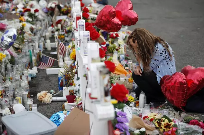 Gloria Garces kneels in front of crosses at a makeshift memorial near the scene of a mass shooting at a shopping complex Tuesday, Aug. 6, 2019, in El Paso, Texas. The border city jolted by a weekend massacre at a Walmart absorbed more grief Monday as the death toll climbed and prepared for a visit from President Donald Trump over anger from El Paso residents and local Democratic leaders who say he isn't welcome and should stay away. (AP PhotoJohn Locher)