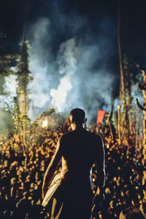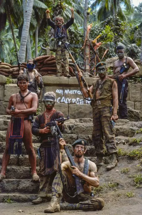 This image provided by Zoetrope Corp. shows Kurtz's army on the steps of his jungle compound in a scene from "Apocalypse Now Final Cut," directed by Francis Ford Coppola. The movie releases in theaters on Aug. 15, 2019. (Chas GerretsenNederlands FotomuseumZoetrope Corp. via AP)