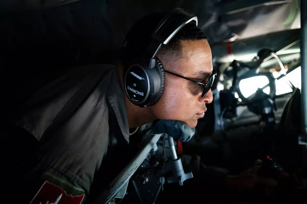 In this photo provided by the U.S. Air National Guard, U.S. Air Force Tech. Sgt. Tyler Simmons, an in-flight refueling specialist with the 121st Air Refueling Wing, refuels a C-17 Globemaster with a KC-135 Stratotanker during a teacher orientation flight at Rickenbacker Air National Guard Base, Ohio, on April 27, 2023. (Airman First Class Ivy Thomas/U.S. Air National Guard via AP)