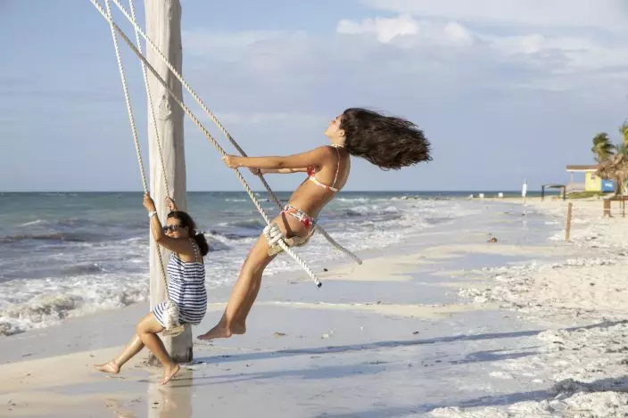 Baltimore tourists Loren Fantasia, left, and her mother, swing on the beach before the arrival of Hurricane Dorian, in Freeport, Bahamas, Friday, Aug. 30, 2019. Forecasters said the hurricane is expected to keep on strengthening and become a Category 3 later in the day. (AP PhotoTim Aylen)