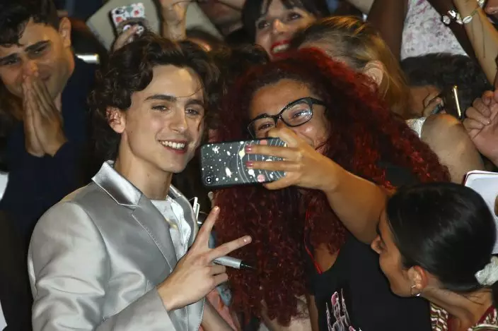 Actor Timothee Chalamet poses for photographs with fans upon arrival at the premiere of the film 'The King' at the 76th edition of the Venice Film Festival, Venice, Italy, Monday, Sept. 2, 2019. (Photo by Joel C RyanInvisionAP)