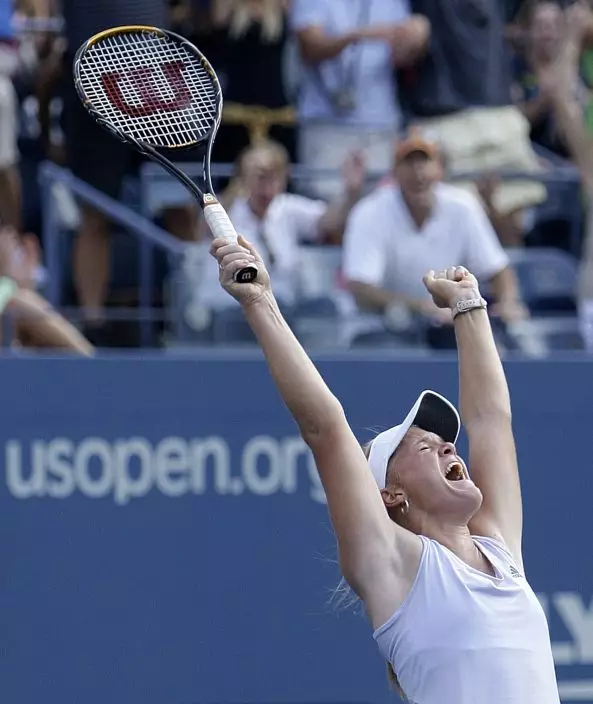 FILE - In this Sept. 5, 2009, file photo, Melanie Oudin, of the United States, celebrates her upset victory over Maria Sharapova of Russia during the third round of the U.S. Open tennis tournament in New York. Oudin won 3-6, 6-4, 7-5. In each of the first four rounds, she played a Russian who was ranked higher than her at No. 70. In each of those matches, Oudin dropped the opening set before coming back to win. (AP PhotoCharles Krupa, File)
