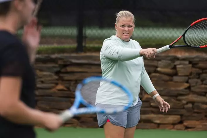 Retired tennis tour professional Melanie Oudin coaches youngsters at Windward Lake Club on Monday, Aug. 26, 2019, in Alpharetta, Ga. A decade after her magical and memorable Grand Slam stay in New York, which followed a just-as-surprising run from qualifier to the fourth round at Wimbledon--like another American teen, Coco Gauff, did to much more fanfare this summer--Oudin is retired from the WTA tour, teaching kids the sport she loves and hoping to coach a pro one day. (AP PhotoJohn Amis)