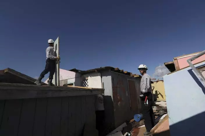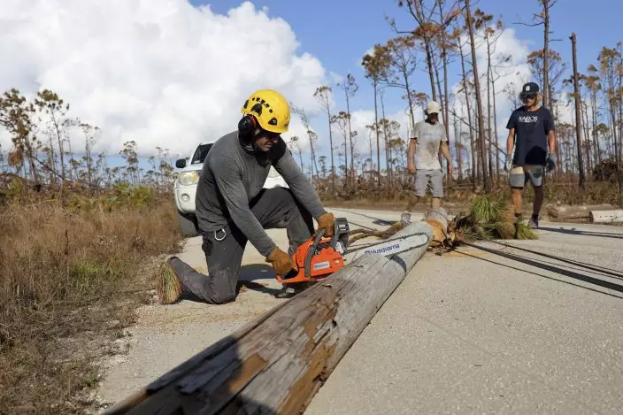 Volunteers cut up electricity poles blocking a road in the aftermath of Hurricane Dorian on the outskirts of Pelican Point in East Grand Bahama, Bahamas, Sunday, Sept. 8, 2019. Electricity remains down in Grand Bahama and there is still no running water one week after the storm hit. (AP PhotoTim Aylen)