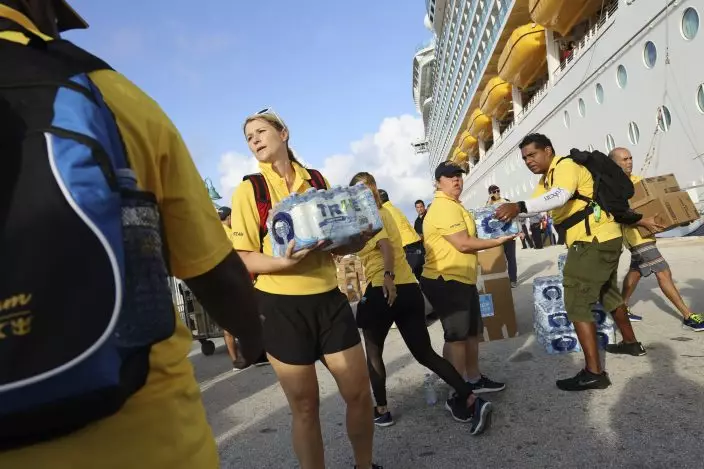 Volunteers from the Royal Caribbean's Go Team load water and relief supplies on to trucks on the quayside of Freeport Harbour in Grand Bahama, Bahamas, Sunday, Sept. 8, 2019, in the wake of Hurricane Dorian. Electricity remains down in Grand Bahama and there is still no running water one week after the storm hit. (AP PhotoTim Aylen)