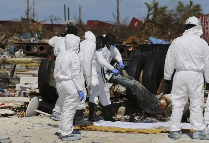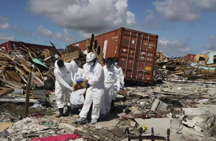 EDS NOTE: GRAPHIC CONTENT - A Bahamas coroners team carries a body out of The Mudd neighborhood in the Marsh Harbor area of Abaco, Bahamas, in the aftermath of Hurricane Dorian, Monday, Sept. 9, 2019. Dorian, the most powerful hurricane in the northwestern Bahamas' recorded history, has killed at least 44 people in Bahamas as of Sunday, Sept. 8, according to the government. (AP PhotoFernando Llano)
