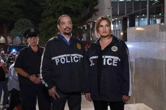 This image released by NBC shows Ice T as Sergeant Odafin "Fin" Tutuola, left, and Mariska Hargitay as Lieutenant Olivia Benson in a scene from "Law & Order: SVU." The show’s 21st season premieres on Sept. 26. (Photo by: Virginia SherwoodNBC via AP)