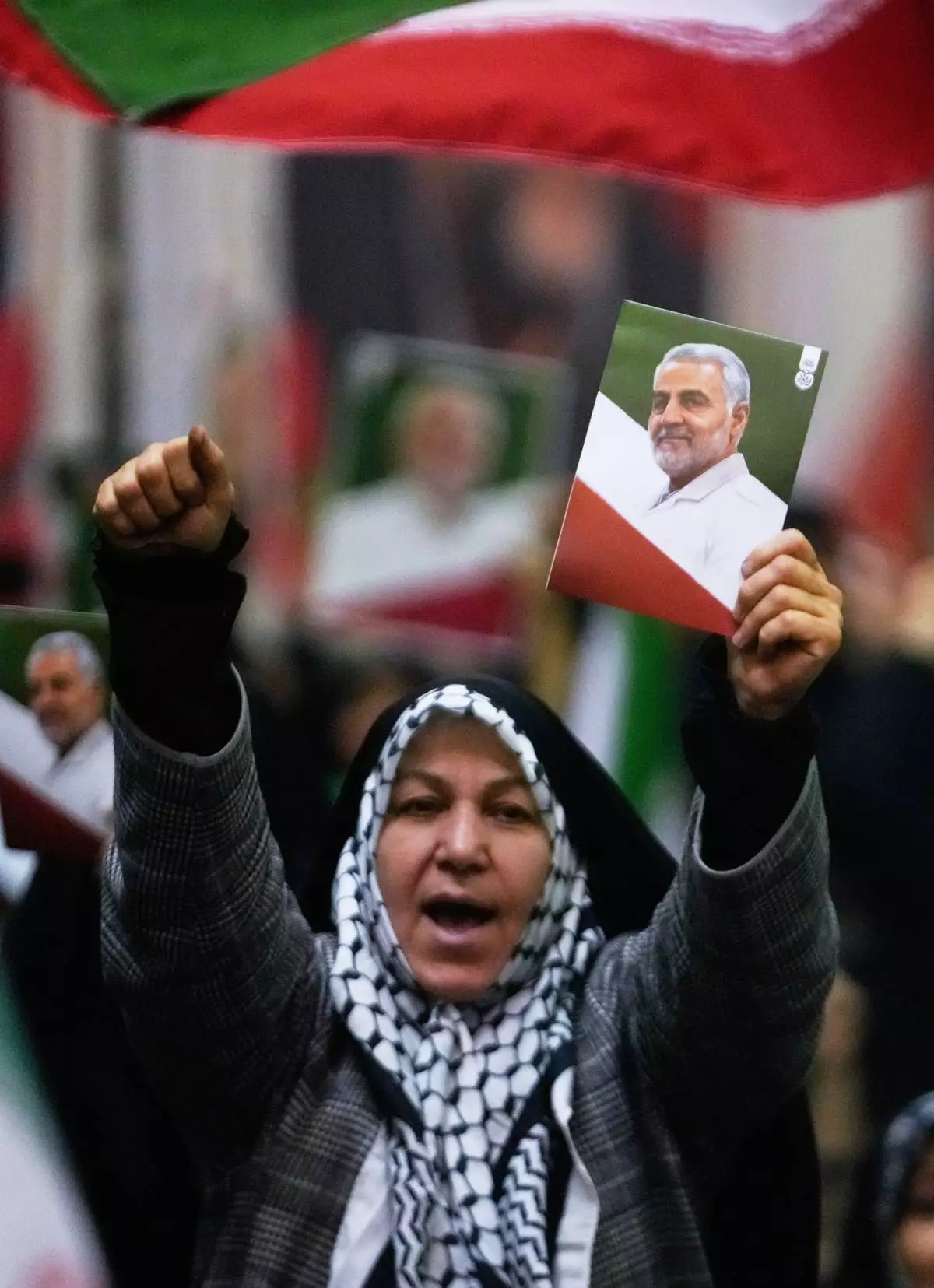 A woman chants slogans as she holds up a poster of the late commander of Iran's Revolutionary Guard expeditionary Quds Force, Gen. Qassem Soleimani, who was killed in a U.S. drone attack in 2020 in Iraq, during a ceremony commemorating his death anniversary at the Imam Khomeini grand mosque in Tehran, Iran, Thursday, Jan. 1, 2026. (AP Photo/Vahid Salemi)