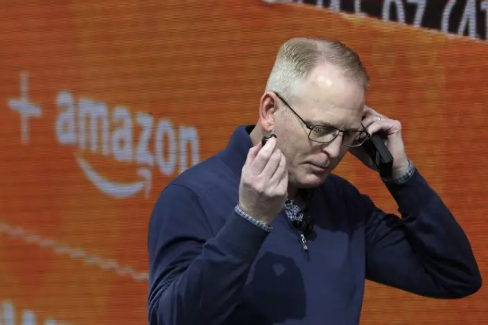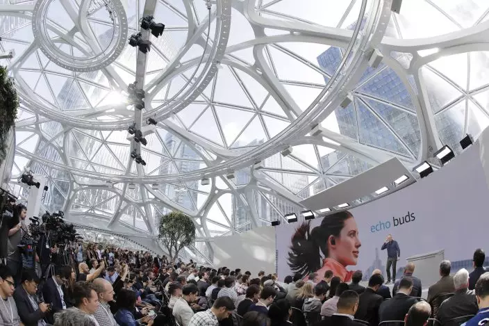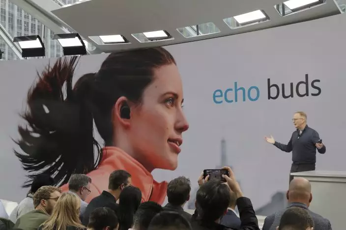 Dave Limp, senior vice president for Amazon devices & services, talks about Echo Buds, the tech company's new wireless earbuds product, Wednesday, Sept. 25, 2019, during an event in Seattle. (AP PhotoTed S. Warren)