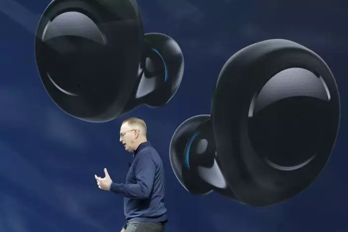 Dave Limp, senior vice president for Amazon devices & services, talks about Echo Buds, the tech company's new wireless earbuds product, Wednesday, Sept. 25, 2019, at an event in Seattle. (AP PhotoTed S. Warren)