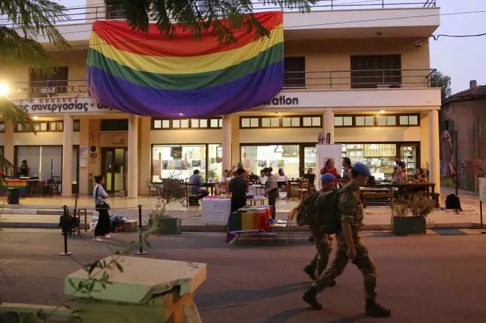 U.N soldiers walk past a rainbow flag during a festival marking the formal collaboration between the two gay rights groups inside the U.N. controlled buffer zone in divided capital Nicosia, Cyprus, Saturday, Oct. 5, 2019. Gay rights groups from both sides of the ethnic divide in Cyprus have formalized their cooperation in raising public awareness about gay rights and working toward buttressing those rights through legislation. (AP PhotoPetros Karadjias)