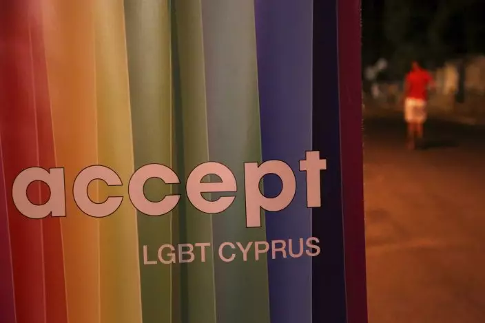 A man passes by a rainbow flag during a festival marking the formal collaboration between the two gay rights groups inside the U.N. controlled buffer zone in divided capital Nicosia, Cyprus, Saturday, Oct. 5, 2019. Gay rights groups from both sides of the ethnic divide in Cyprus have formalized their cooperation in raising public awareness about gay rights and working toward buttressing those rights through legislation. (AP PhotoPetros Karadjias)