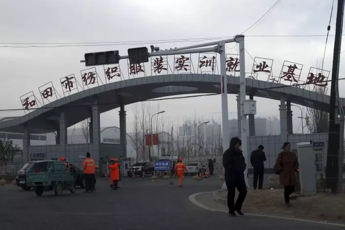 FILE - In this Dec. 5, 2018, file photo, residents pass by the entrance to the "Hotan City apparel employment training base" where Hetian Taida Apparel Co. has a factory in Hotan in western China's Xinjiang region. The Trump Administration is blocking shipments from Chinese company Hetian Taida Apparel, which makes baby pajamas sold at Costco warehouses, after the foreign manufacturer was accused of forcing ethnic minorities locked in an internment camp to sew clothes against their will. (AP PhotoNg Han Guan, File)