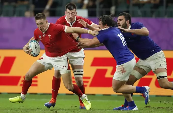 Wales' Liam Williams, left, fends off France's Camille Chat (16) during the Rugby World Cup quarterfinal match at Oita Stadium in Oita, Japan, Sunday, Oct. 20, 2019. (AP PhotoChristophe Ena)