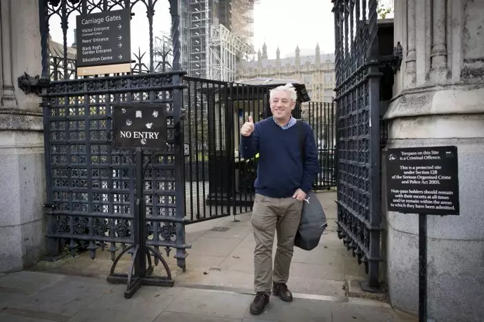 Britain's Speaker of the House of Commons, John Bercow arrives at Parliament in London, Thursday Oct. 31, 2019, on his last day as Speaker of the House of Commons after 10 years in the position. (Stefan RousseauPA via AP)