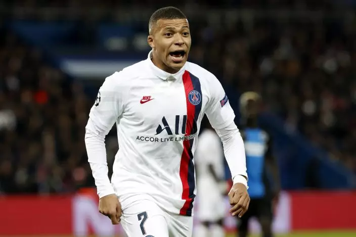 PSG's Kylian Mbappe reacts during a Champions League group A soccer match between Paris Saint Germain and Club Brugge, at the Parc des Princes stadium, in Paris, Wednesday, Nov. 6, 2019. (AP PhotoThibault Camus)