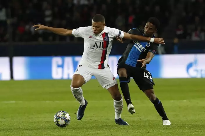 PSG's Kylian Mbappe, right, fights for the ball with Brugge's Emmanuel Dennis during a Champions League group A soccer match between Paris Saint Germain and Club Brugge, at the Parc des Princes stadium, in Paris, Wednesday, Nov. 6, 2019. (AP PhotoThibault Camus)