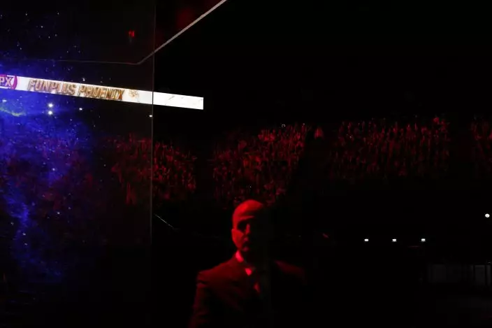A security guard stands during the final of League of Legends tournament between Team G2 Esports and Team FunPlus Phoenix, in Paris, Sunday, Nov. 10, 2019. The biggest e-sports event of the year saw a Chinese team, FunPlus Phoenix, crowned as world champions of the video game League of Legends. Thousands of fans packed a Paris arena for the event, which marked another step forward for the growing esports business. (AP PhotoThibault Camus)