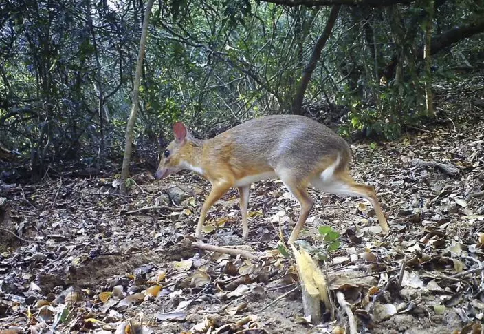 In this Apr. 22, 2018, photo, a silver-backed chevrotain is captured on a camera trap in an undisclosed forest in south central Vietnam. The species, commonly known as Vietnamese mouse deer, was rediscovered after 30 years. (Southern Institute of EcologyGlobal Wildlife ConservationLeibniz Institute for Zoo and Wildlife ResearchNCNP via AP)