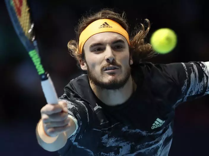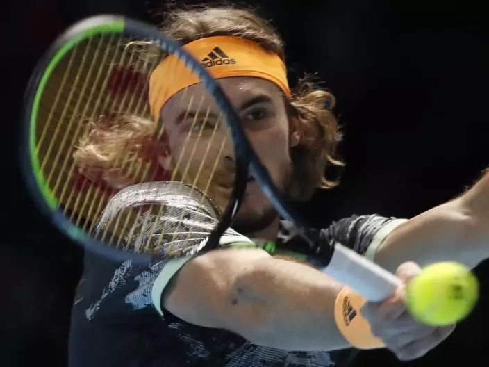 Stefanos Tsitsipas of Greece plays a return to Spain's Rafael Nadal during their ATP World Tours Finals singles tennis match at the O2 Arena in London, Friday, Nov. 15, 2019. (AP PhotoAlastair Grant)