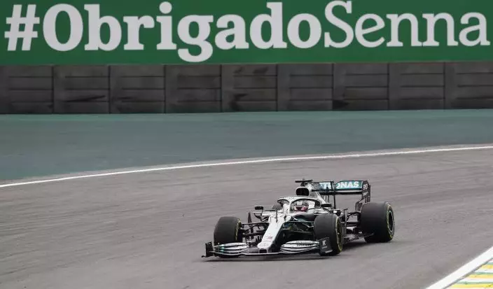 Mercedes driver Lewis Hamilton, of Britain, steers his car during the second free practice at the Interlagos race track in Sao Paulo, Brazil, Friday, Nov. 15, 2019. The banner in Portuguese reads: ''#Thank you Senna'' in honor of the three-time FIA Formula One World Champion Ayrton Senna. (AP PhotoNelson Antoine)
