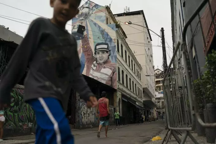 In this Nov. 7, 2019 photo, people walk past a building decorated with mural art depicting legendary Brazilian F1 driver Ayrton Senna, in Rio de Janeiro, Brazil. Rio has the exuberance of samba and Carnival, plus dramatic postcard views of beaches and verdant mountains. Now, to Sao Paulo's chagrin, Rio is pushing for an F1 racetrack, too. (AP PhotoLeo Correa)