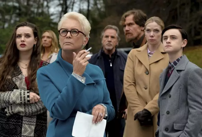 This image released by Lionsgate shows Katherine Langford, from left, Toni Collette, Jamie Lee Curtis, Don Johnson, Michael Shannon, Riki Lindholm and Jaeden Lieberher in a scene from "Knives Out." (Claire FolgerLionsgate via AP)